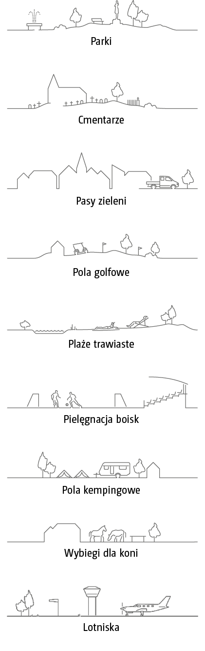 Ponadto kosiarki GH i HH nadają się również do pielęgnacji wysokiej jakości trawników na polach golfowych, terenach jeździeckich czy instalacjach sportowych – jest to więc bardzo szerokie spektrum zastosowań połączone z dużą wydajnością, przez co maszyna w całym okresie eksploatacji pozostaje wysoce rentowna.