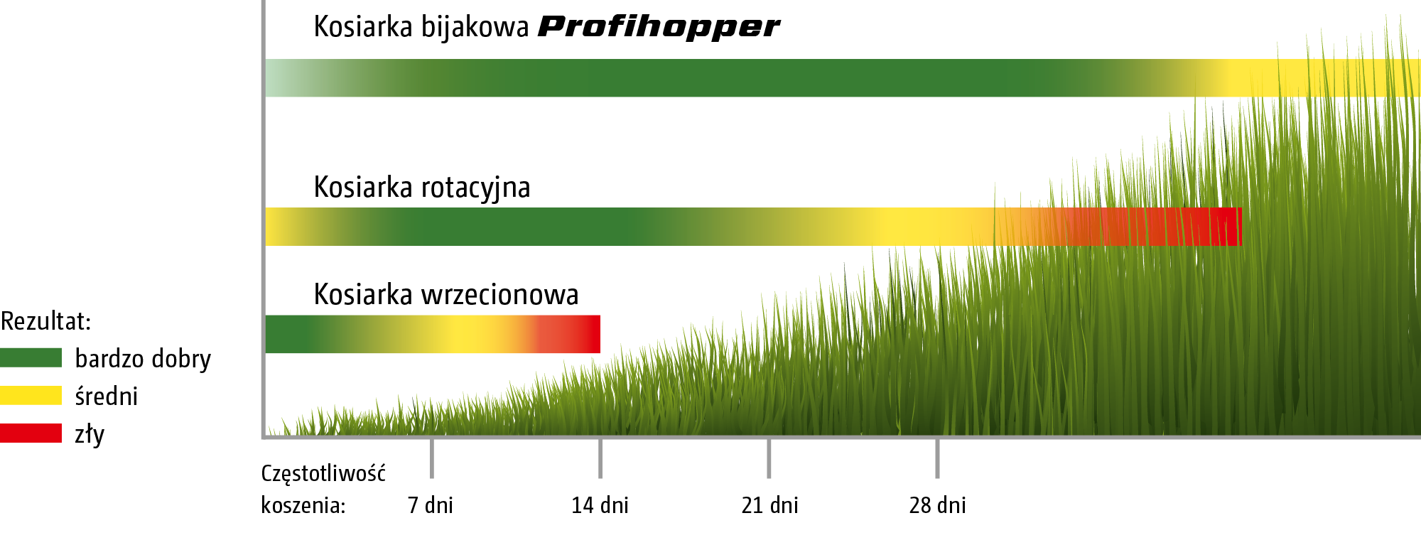 W porównaniu z kosiarką rotacyjną oraz kosiarką wrzecionową, Profihopper z bijakowym zespołem koszącym pracuje bardzo niezawodnie również na wysokiej trawie. Zarówno w przypadku krótkiej, jak i długiej trawy Profihopper zapewnia znakomity rezultat koszenia we niemal wszystkich warunkach pogodowych i wegetacyjnych.