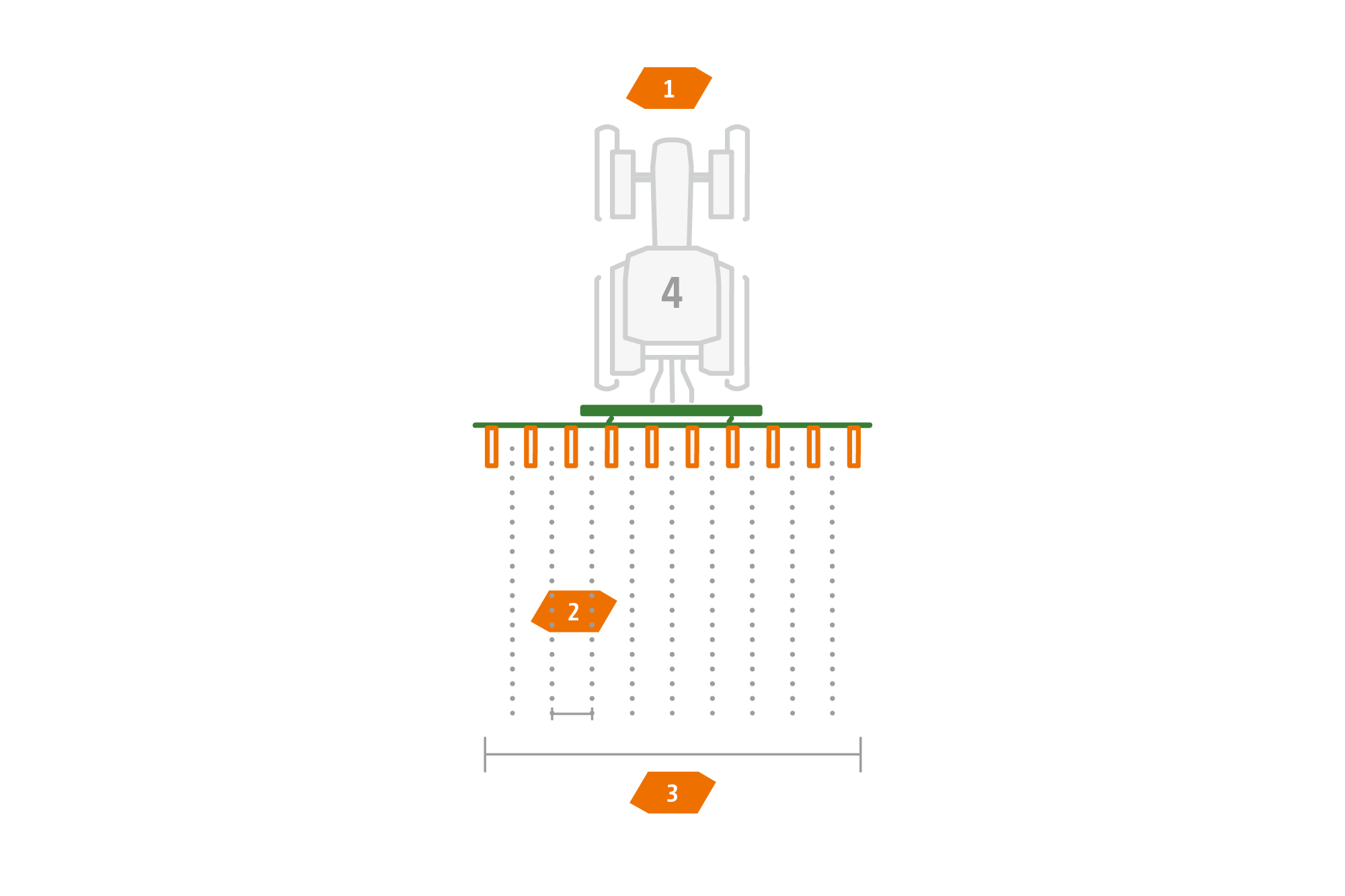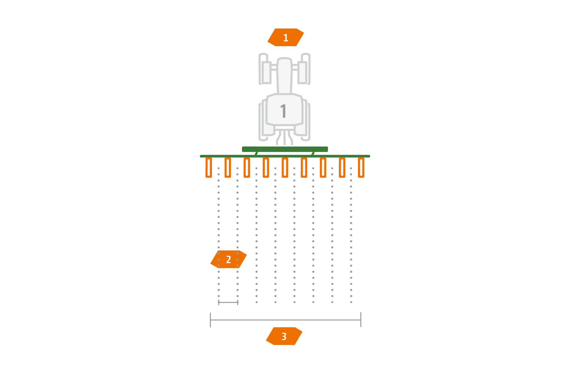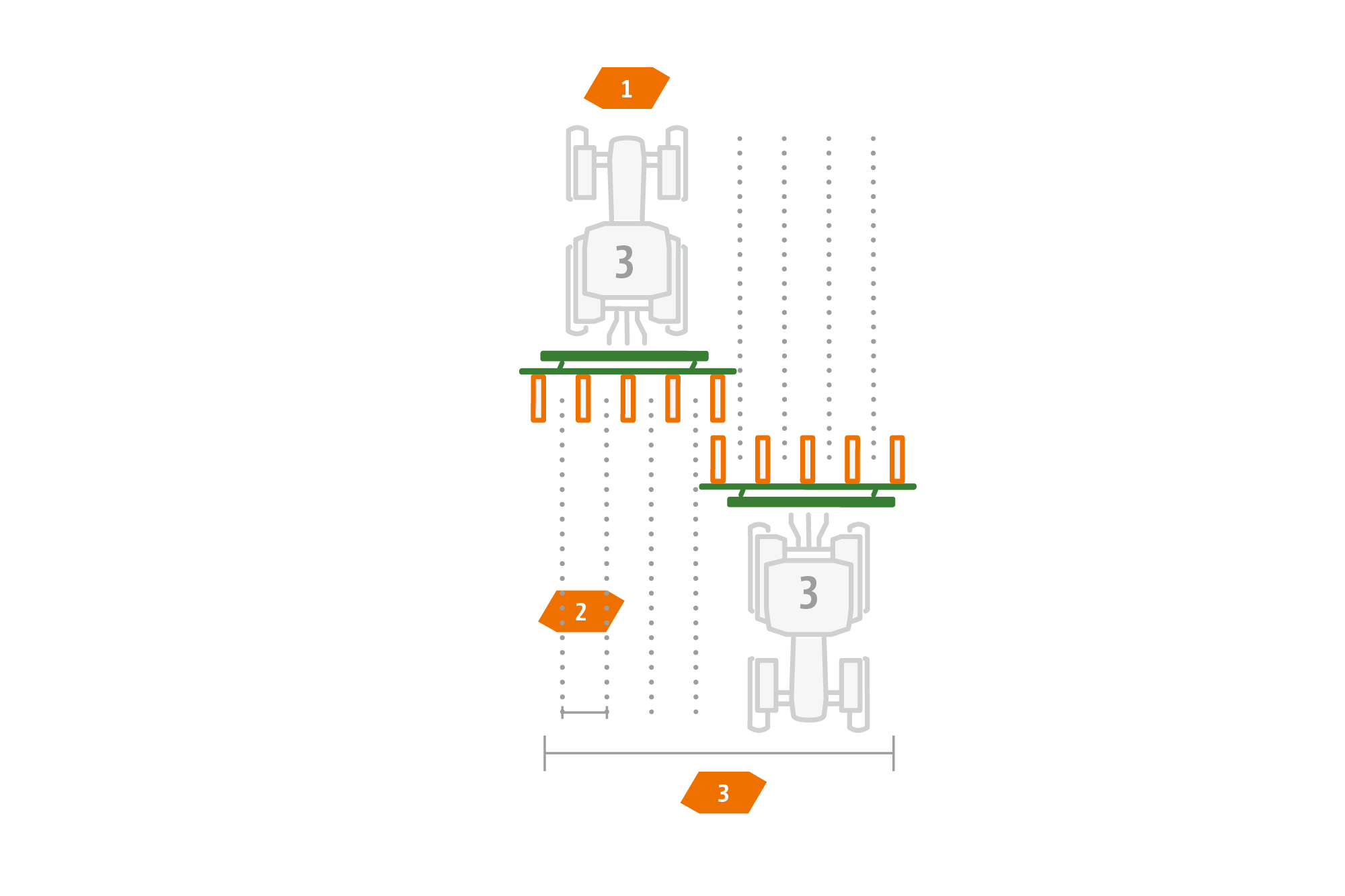Poniższa ilustracja pokazuje, jak można zainstalować różne rozstawy kół (SW) i szerokości robocze przy rozstawie rzędów 75 cm. W zależności od rozstawu kół ciągnika pielnik jest skonstruowany symetrycznie (przykład 1 i 4) lub asymetrycznie (przykład 2). Przy dużych szerokościach siewu można również zastosować pielnik z połową szerokości siewu (przykład 3).