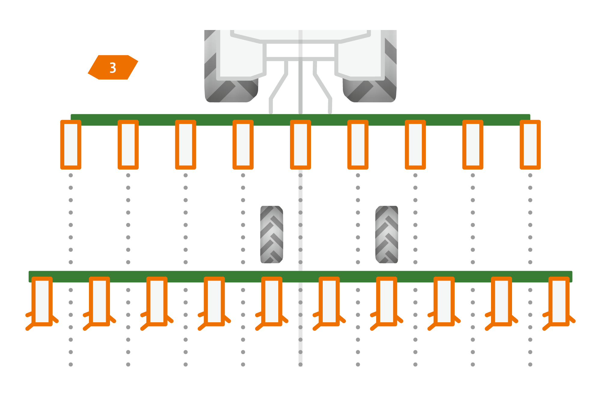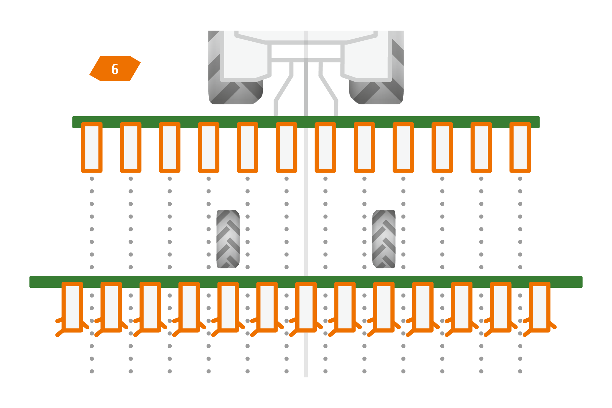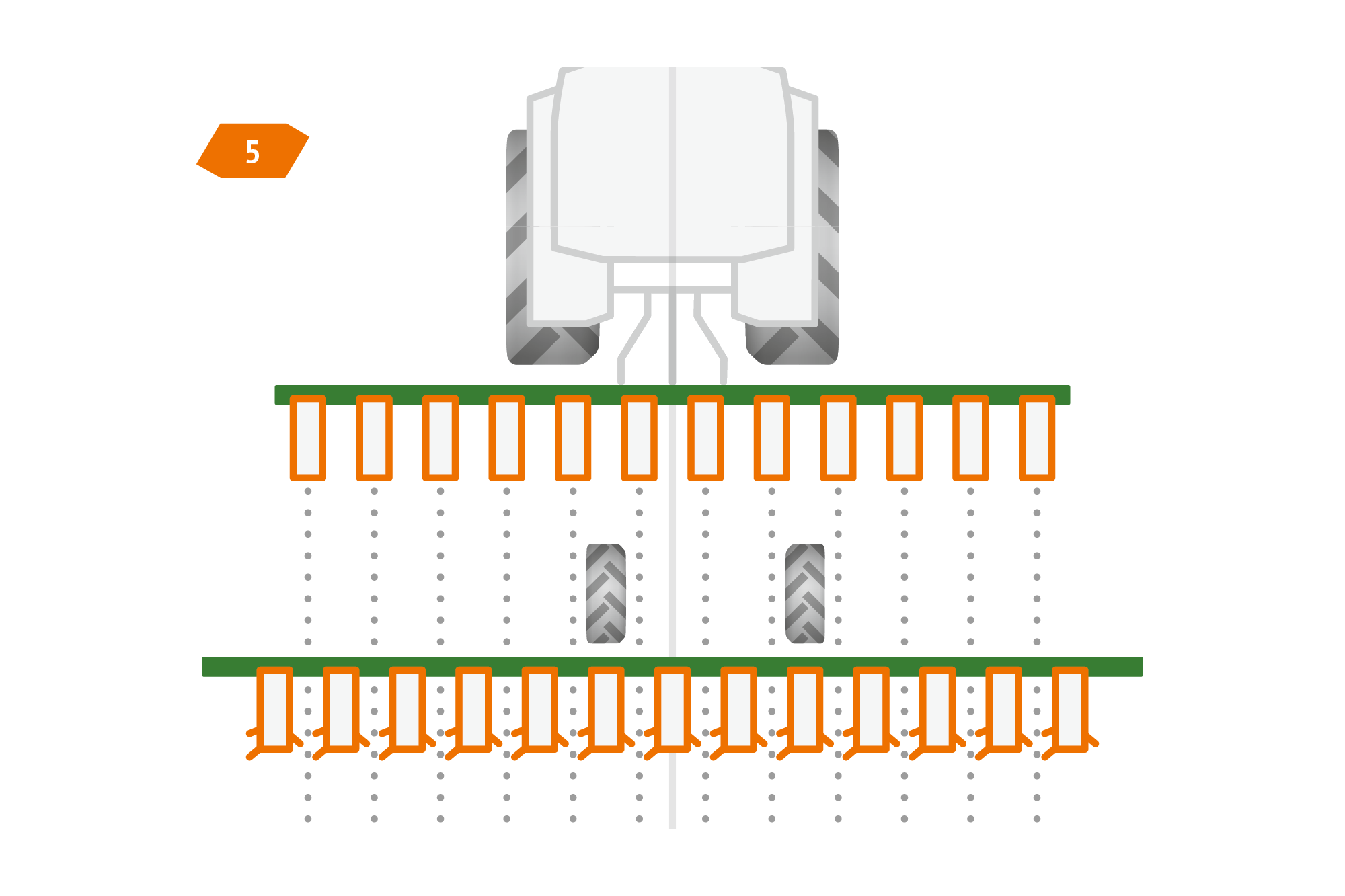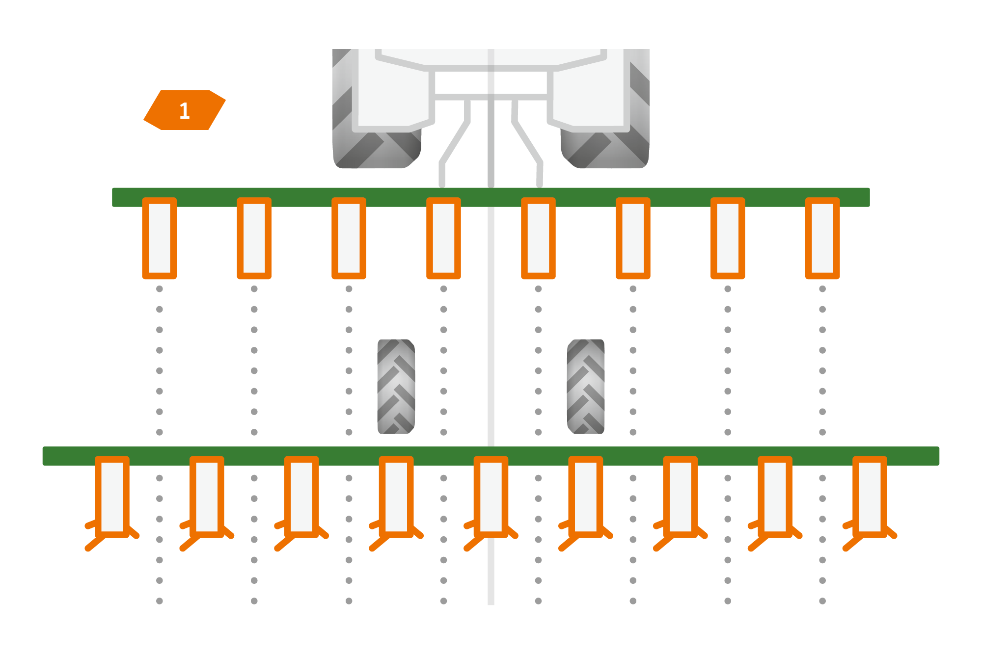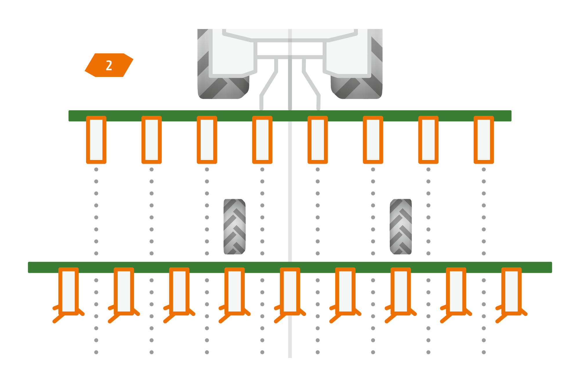- Rozstaw kół 225 cm umożliwia jazdę pielęgnacyjną, ale konieczne jest asymetryczne agregatowanie
