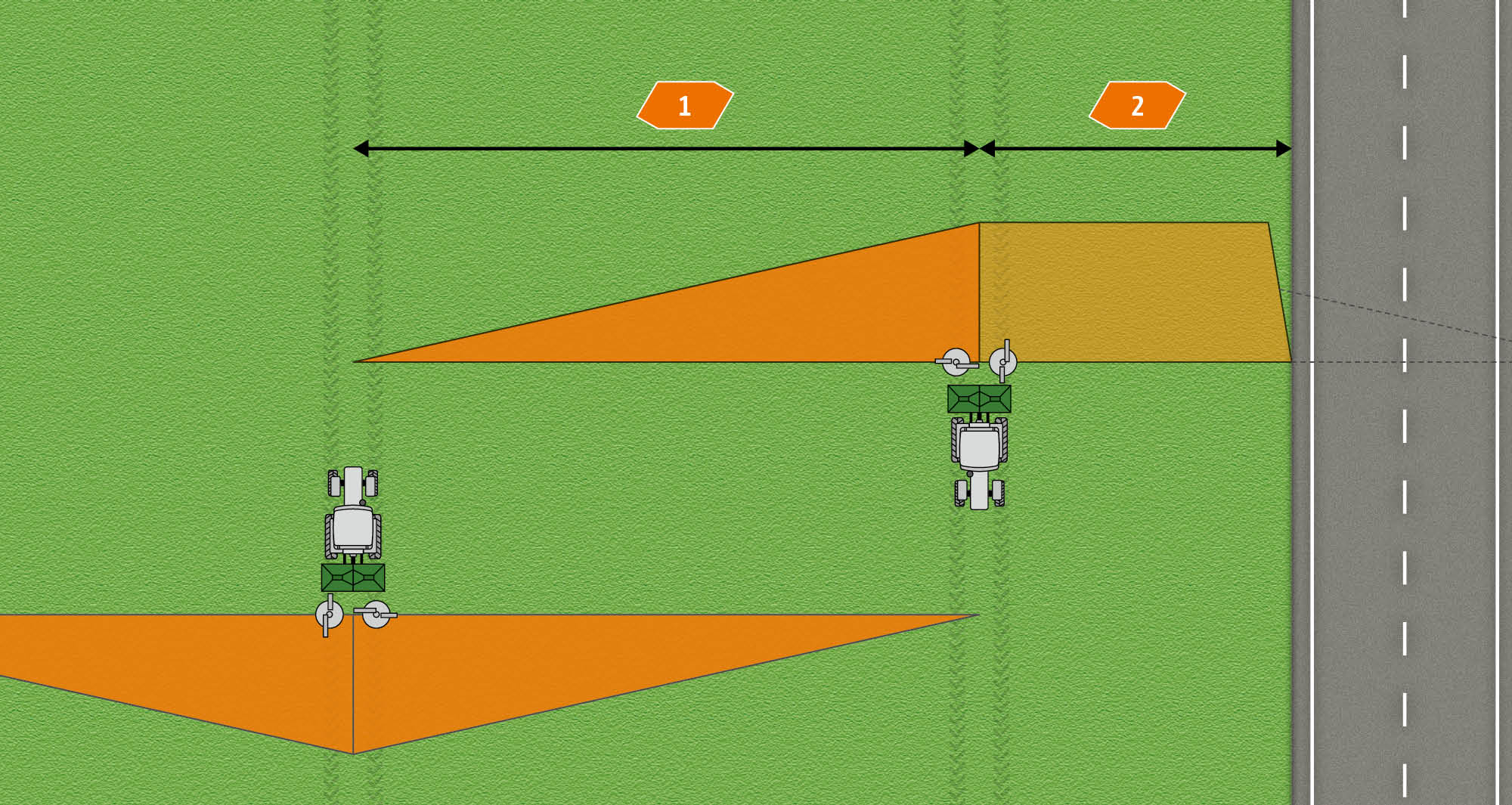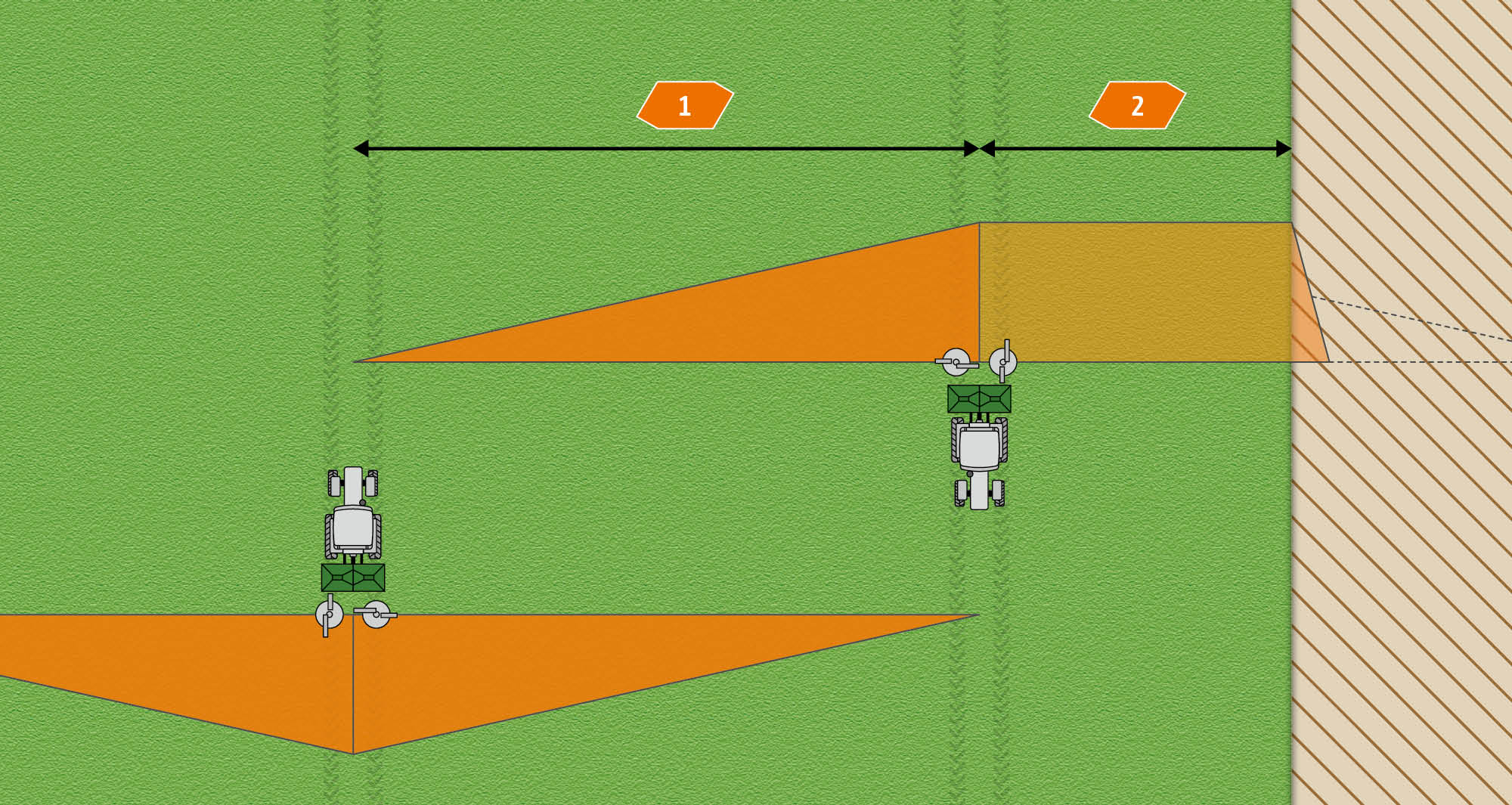 W zależności od szerokości roboczej, tarczy rozsiewającej i nawozu, charakterystyka HeadlandControl może być różna. Dlatego też HeadlandControl oblicza indywidualnie optymalny wachlarz rozsiewu dla każdego przejazdu.