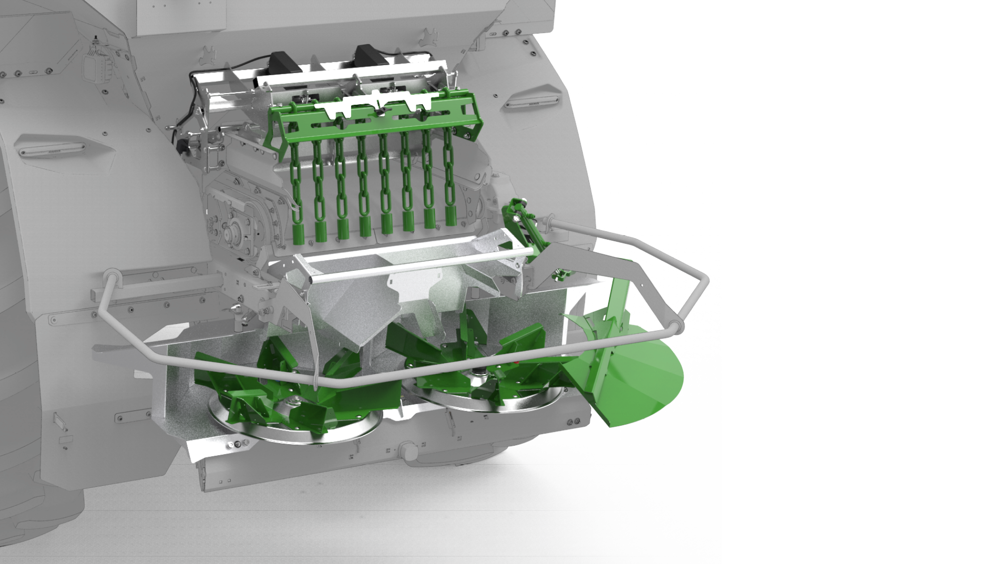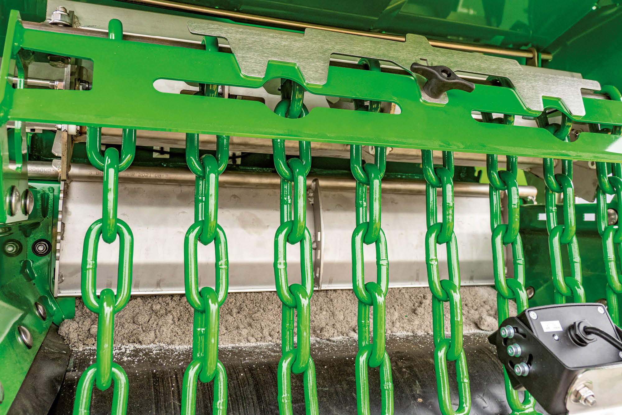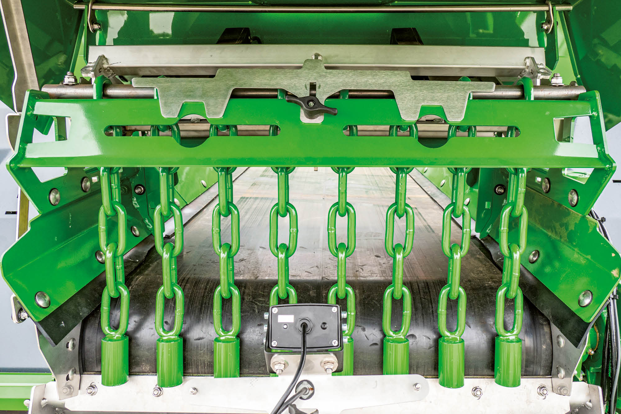 Opcjonalny łańcuch rozdrabniający zapewnia równomierne i czyste zaopatrywanie tarcz rozsiewających przez taśmę nośną. W trakcie użytkowania ZG-TX do rozsiewania nawozów mineralnych łańcuchy mogą zostać w łatwy i wygodny sposób odwieszone na uchwyt.
