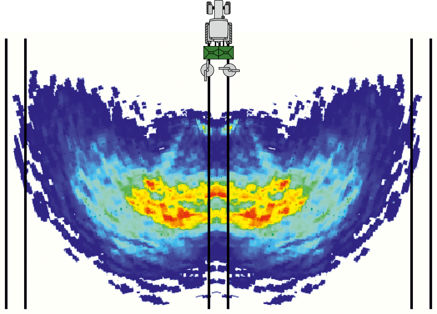 Układ rozsiewu został zaprojektowany z wykorzystaniem trójwymiarowych obrazów rozsiewu w celu zapewnienia idealnego rozkładu poprzecznego dla efektywnych szerokości roboczych do 54 m. Duże strefy nakładania się zapewniają perfekcyjny obraz rozsiewu i są znacznie bardziej stabilne w stosunku do wszystkich czynników zewnętrznych, takich jak wiatr boczny, nachylenie zbocza, wilgotność powietrza i zmieniająca się jakość nawozu.