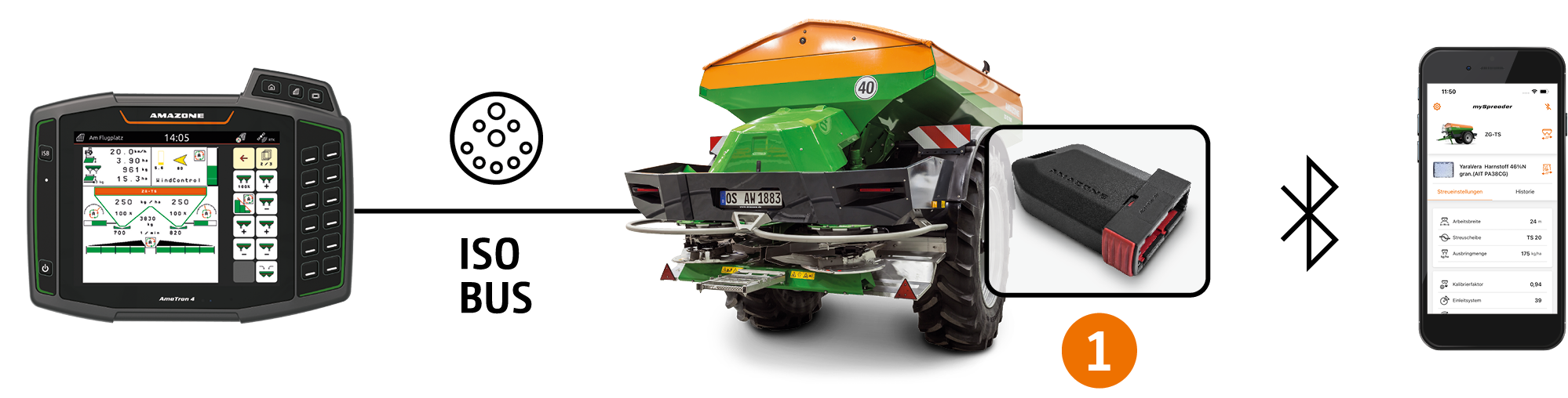 Dzięki adapterowi Bluetooth wszystkie wartości nastawcze z aplikacji mySpreader można przenieść do rozsiewacza nawozów AMAZONE. Pozwala to zaoszczędzić czas, uniknąć błędów w ustawieniach i jest znacznie wygodniejsze.