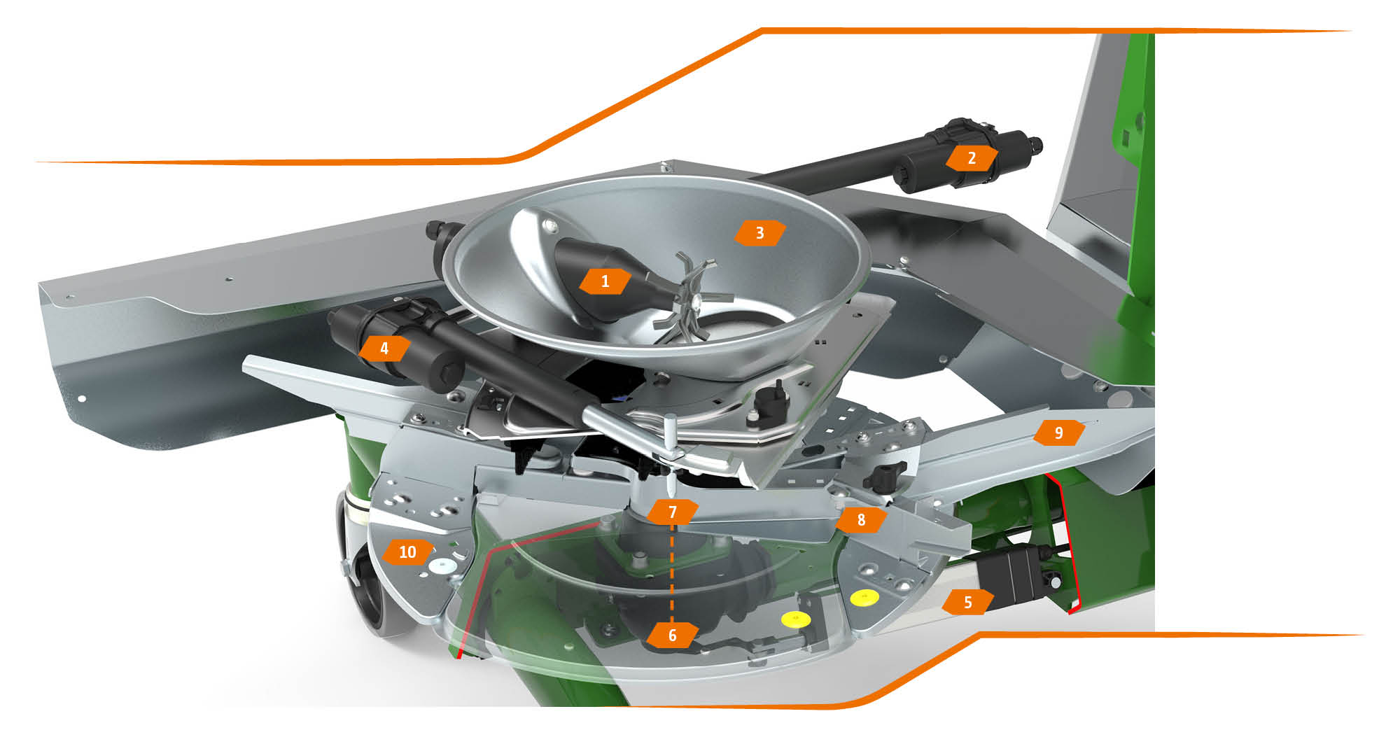 Koncentryczny ruch systemu dozowania wokół środka tarczy umożliwia precyzyjne dostosowanie do różnych szerokości roboczych i rodzajów nawozu, jednocześnie chroniąc nawóz poprzez podawanie go blisko środka tarczy rozsiewającej.