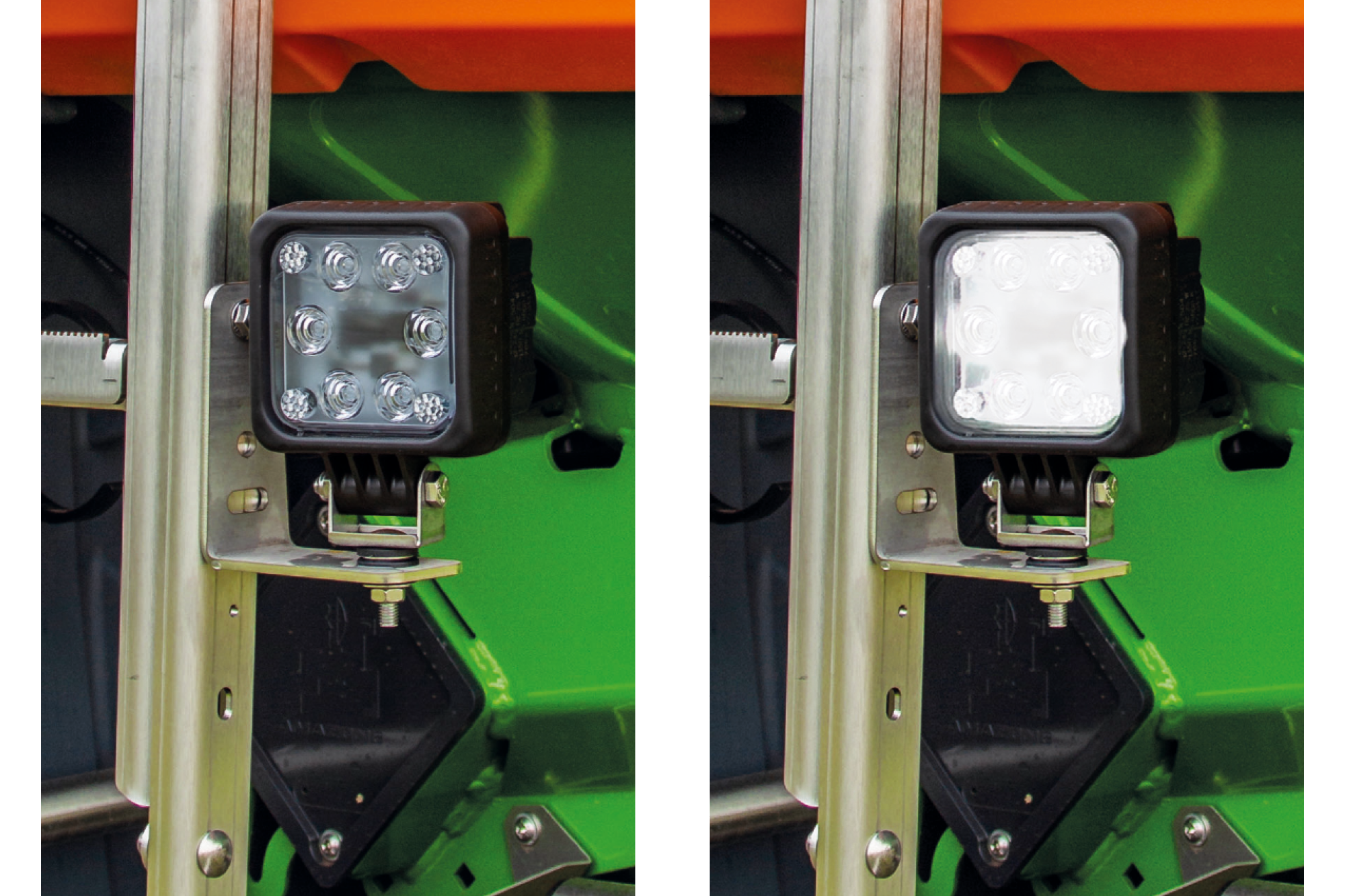 Obejmuje on reflektory robocze LED w zbiorniku, nad tarczami rozsiewającymi i po bokach rozsiewacza. W ten sposób nawet w ciemności jest zagwarantowane, że użytkownik ma ogląd stanu napełnienia zbiorniku oraz dysponuje wystarczającym oświetleniem umożliwiającym wymianę tarcz rozsiewających oraz ustawianie teleskopów na łopatkach.