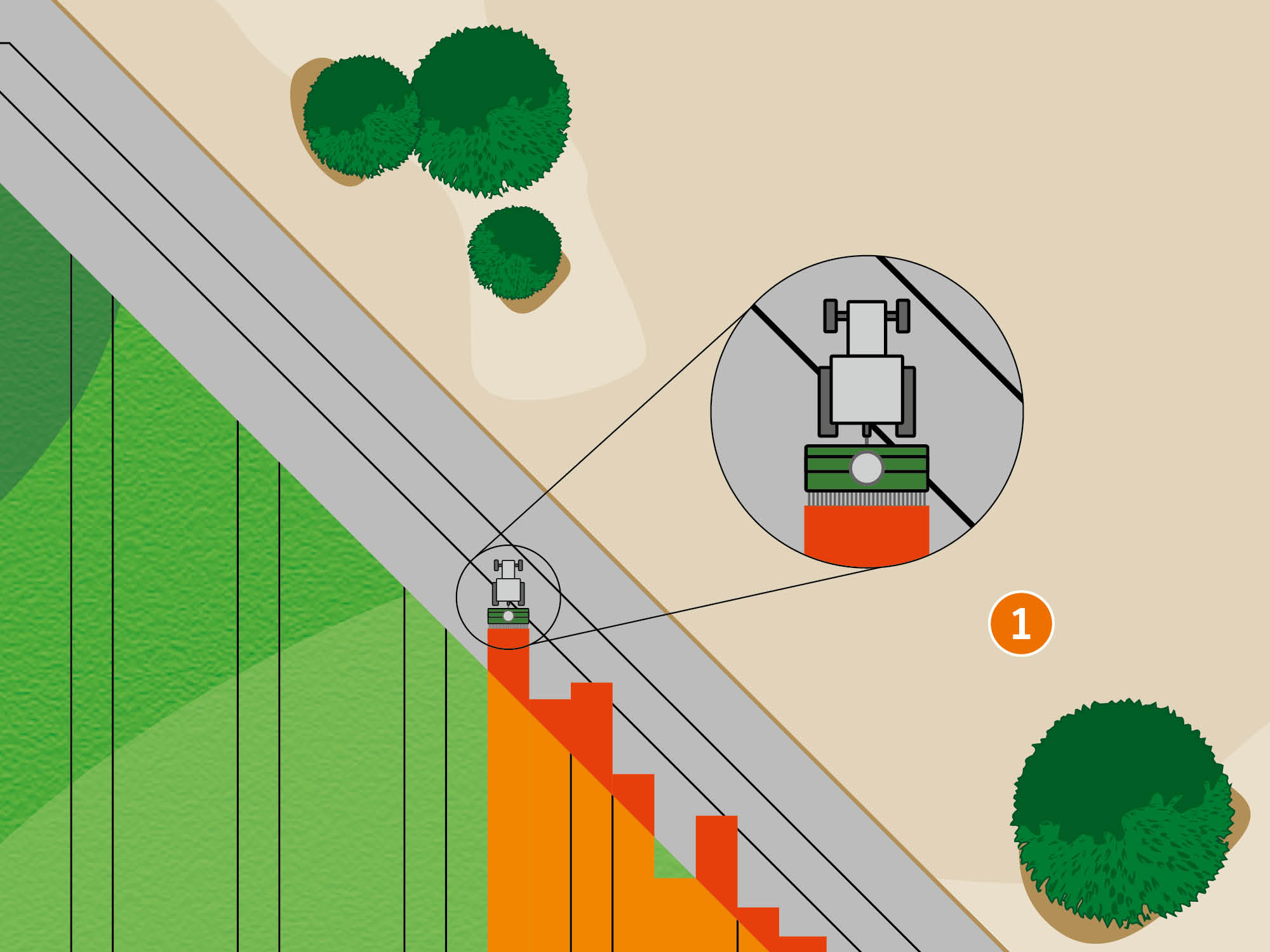 Jeśli terminal obsługowy posiada funkcję Section Control, jak np. przełączanie sekcji szerokości GPS-Switch firmy AMAZONE, to mogą być one przełączane całkowicie automatycznie w zależności od pozycji GPS. Jeśli utworzono pole, kierowca może w trybie automatycznym w pełni skoncentrować się na obsłudze pojazdu, ponieważ sekcje szerokości są przełączane automatycznie w klinach i na poprzeczniakach.