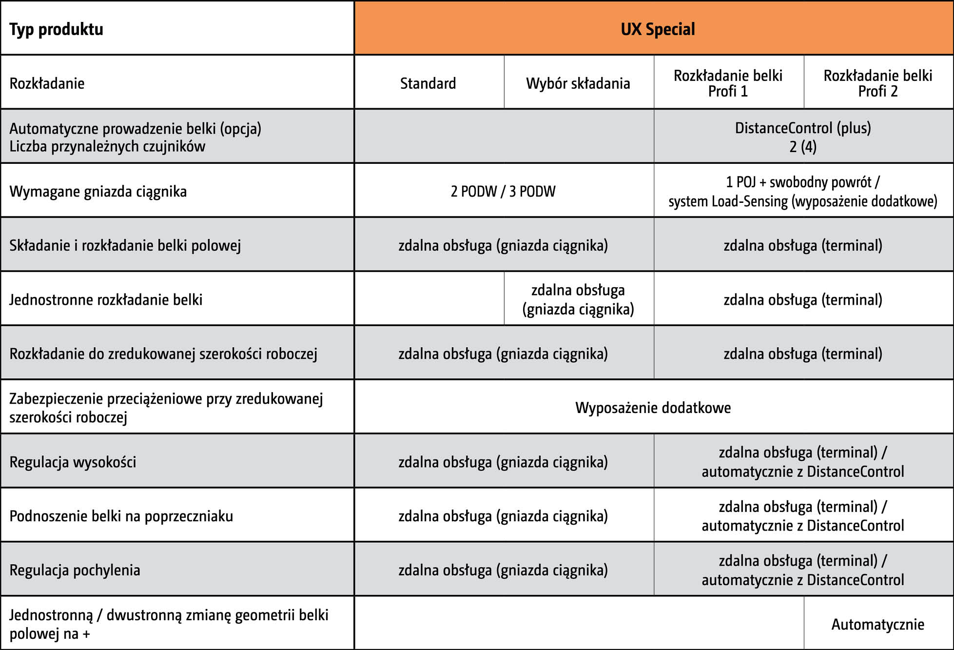 Zmiana wysokości, rozkładanie / składanie, składanie jednostronne ze zredukowaną prędkością (maks. 6 km/h), redukcja szerokości belki polowej, regulacja pochylenia belki.