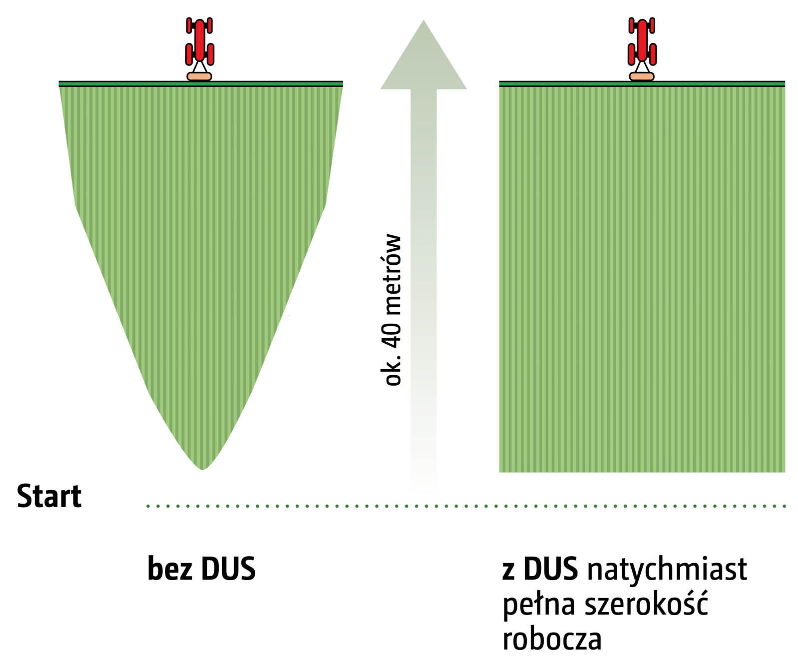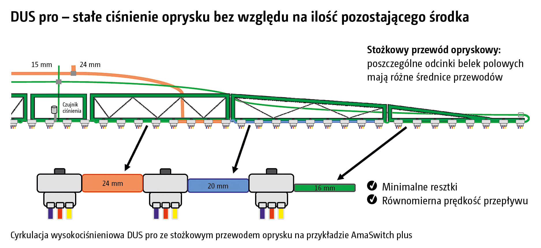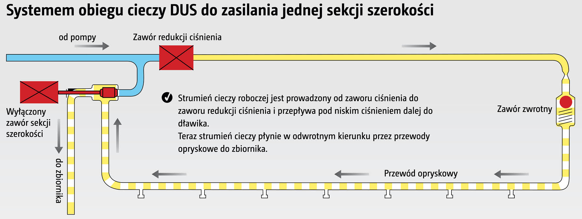 System obiegu cieczy AMAZONE DUS gwarantuje bezpieczną cyrkulację w całym systemie. Na początku pracy system przewodów wraz z przewodem opryskowym jest najpierw napełniany cieczą roboczą pod ciśnieniem i w przeciwnym kierunku. W ten sposób przewody opryskowe są zawsze napełnione i gotowe do natychmiastowej pracy na całej szerokości roboczej. Wyeliminowano czasy oczekiwania przed rozpoczęciem pracy.