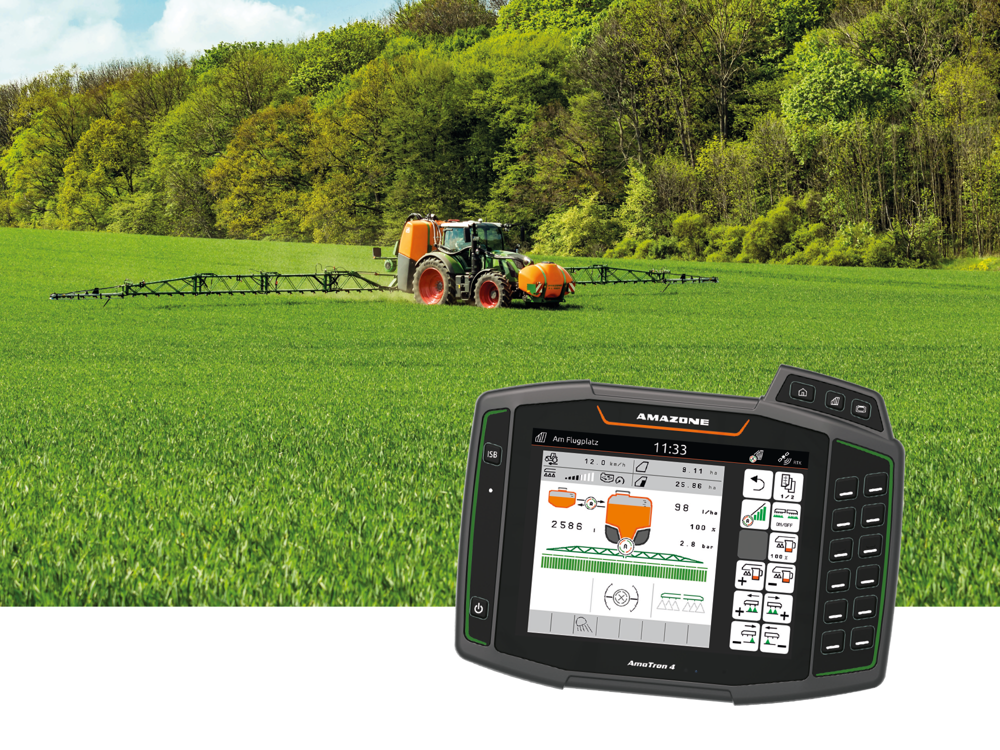 Terminal ISOBUS steruje automatycznie przepływem cieczy i optymalizuje rozkład masy. Wyeliminowane jest zbyt wczesne odciążenie przedniej osi ciągnika. Zależnie od stanu napełnienia, ze zbiornika przedniego dosyłana jest konieczna ilość cieczy i przed opróżnieniem zbiornika przedniego opryskiwacz zawieszany nigdy nie jest pusty. Ciecz robocza zawsze ma takie samo stężenie.