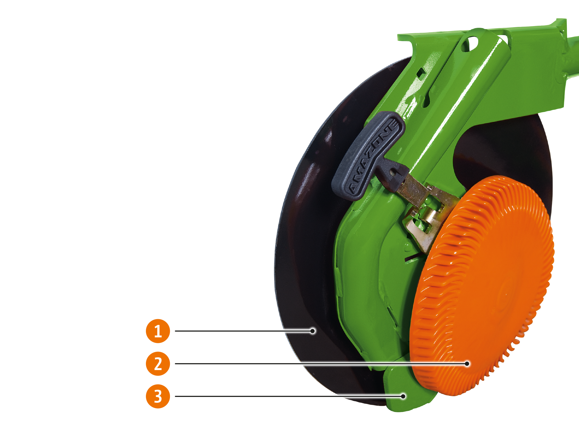 Równe i dokładnie kontrolowane, utrzymywanie głębokości redlic RoTeC-Control osiągane jest przez tarczę Control 10 o szerokości 10 mm albo przez tarczę Control 25 o szerokości 25 mm. Ponieważ tarcze te zamontowane są bezpośrednio z boku redlicy, to pracują one dokładniej, niż redlica z ułożyskowaną, na stałe dołączaną rolką kopiującą głębokość. Tarczami lub rolkami ograniczającymi szybko, łatwo i komfortowo dokonuje się podstawowego ustawienia głębokości siewu przez nacisk redlic. Jeśli to konieczne, można bez żadnych narzędzi regulować redlicę w 3 pozycjach zapadkowego segmentu przestawiającego.