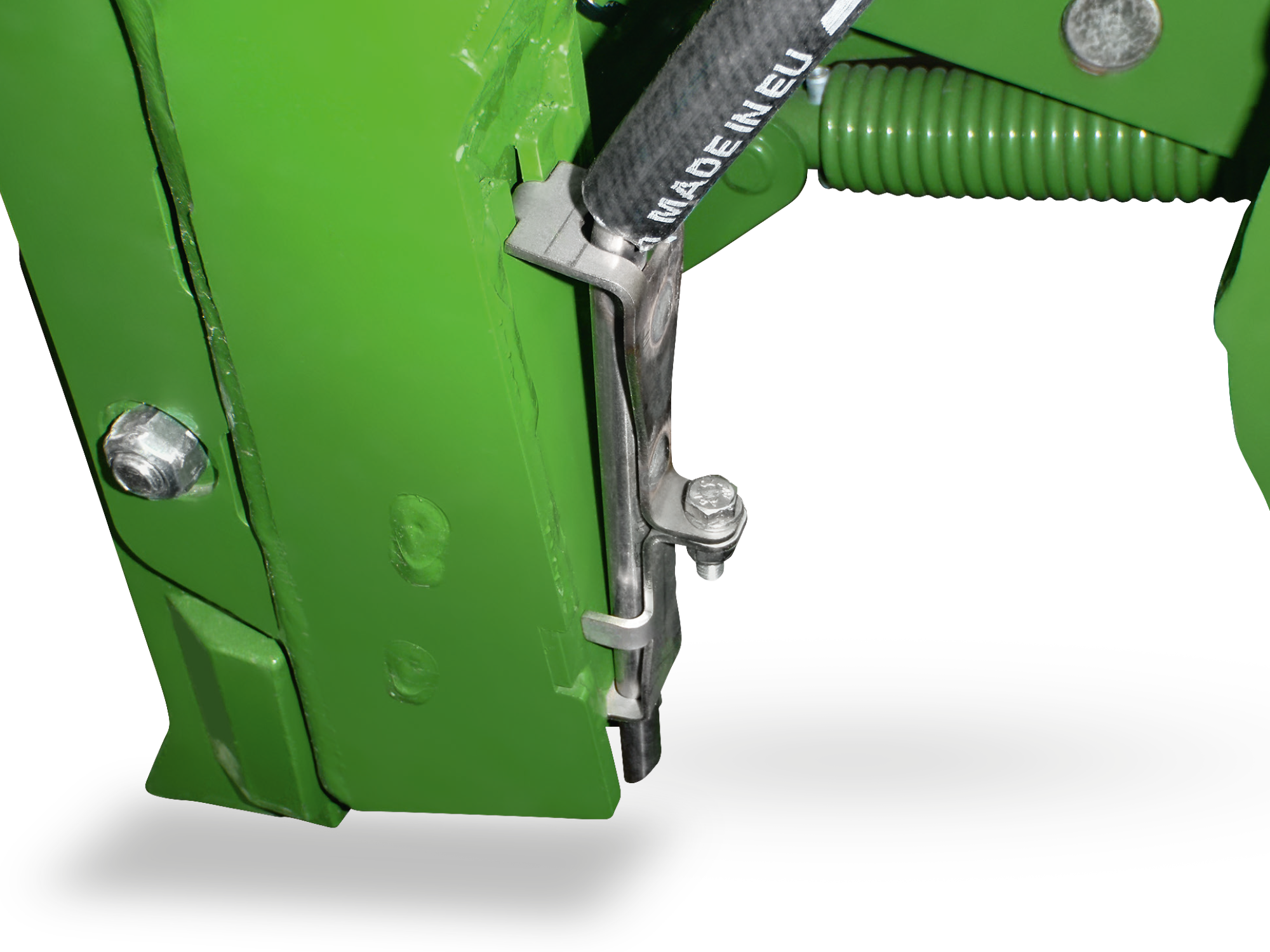 Ciężar jest optymalnie rozłożony na podłożu dzięki dużym oponom 800/45/26,5, które mają dużą powierzchnię styku, co nie niszczy naturalnej struktury podłoża. Zbiornik na nawóz można w razie potrzeby zamontować do ciągnika za pomocą zawieszenia dźwigni dolnych kat. 3, 4 lub K700, stosując ucho dyszla lub głowicę kulową. Aby zapewnić optymalny rozkład masy i lepszą trakcję ciągnika, dyszel jest standardowo obciążony dodatkową masą. Do dołączania i odłączania siewnika oraz do poziomego ustawienia maszyny dyszel seryjnie wyposażono w siłownik hydrauliczny. Standardowo uchwyty na węże znajdują się na dyszlu, gdzie można zawiesić przewody hydrauliczne i przyłącza elektryczne po odłączeniu urządzeń, utrzymując je w porządku i czystości.