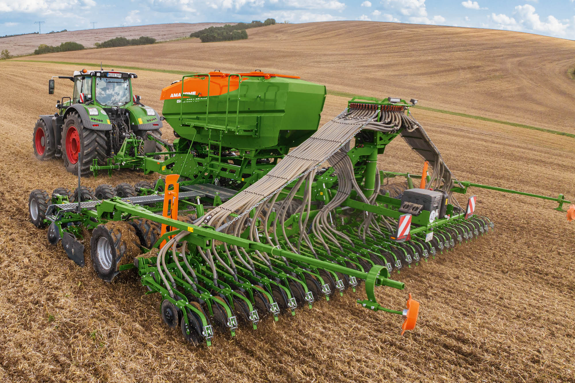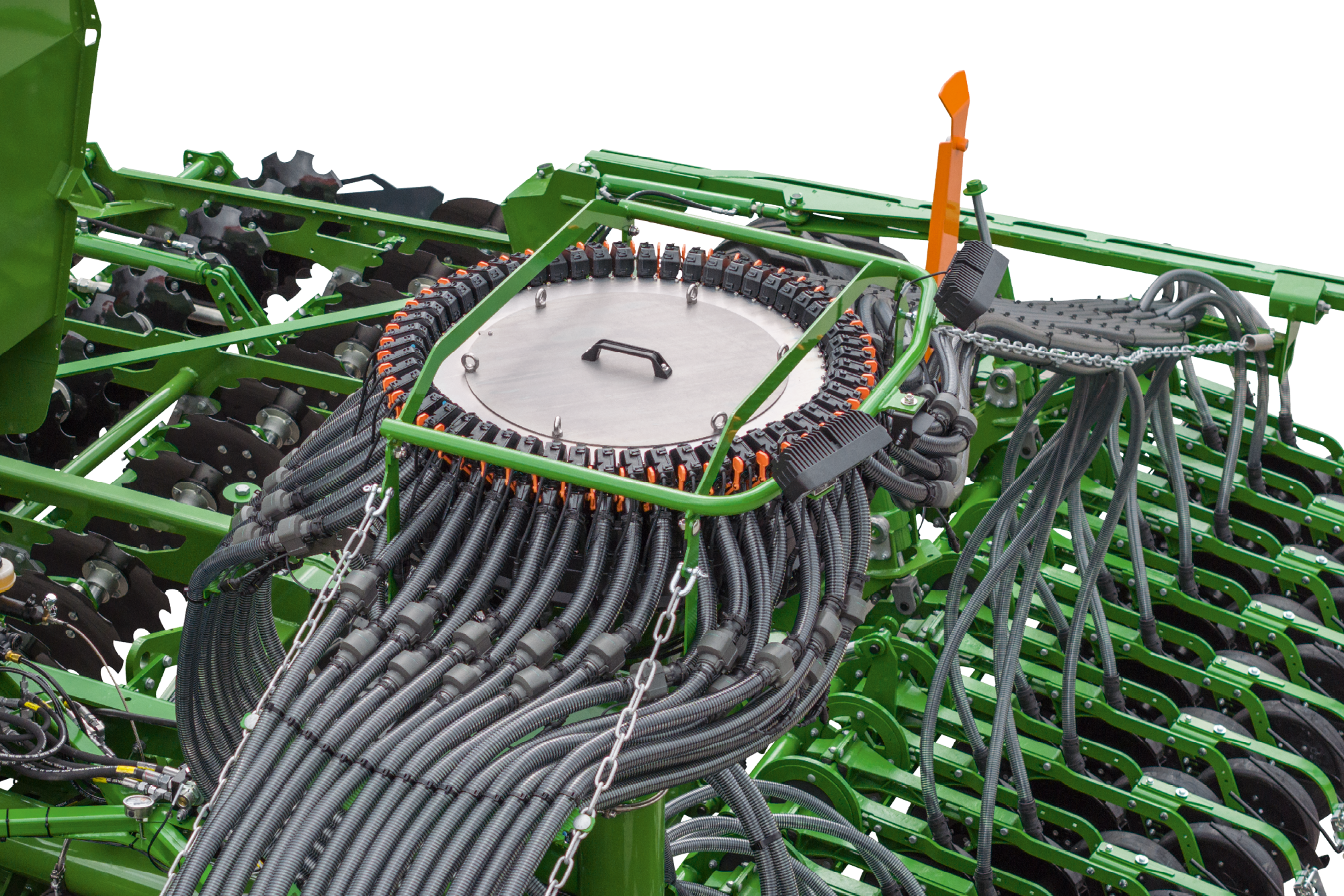 Głowica rozdzielająca zapewnia prawidłowy rozdział poprzeczny. Jest ona wyposażona w funkcję wyłączania poszczególnych rzędów i gwarantuje oszczędność materiału siewnego i nawozu, co odpowiada wymaganiom zrównoważonego rozwoju. W celu założenia ścieżki technologicznej można ustawić głowicę rozdzielającą w sposób przyjazny dla użytkownika na terminalu ISOBUS, który obsługuje wszystkie symetryczne i asymetryczne systemy ścieżek, a także różne ich szerokości i rozstawy kół. Nie ma potrzeby ingerencji mechanicznej. Ze względu na to, że przewody doprowadzające materiał do zewnętrznych redlic są dłuższe niż przewody wewnętrzne, opóźnione otwieranie i zamykanie (kompensacja V) przełączania pojedynczych rzędów ogranicza dodatkowe nakładki na poprzeczniakach. Przy ruszaniu rzędy najpierw są obsiewane od zewnątrz do środka, a przy zatrzymywaniu od środka do zewnątrz.