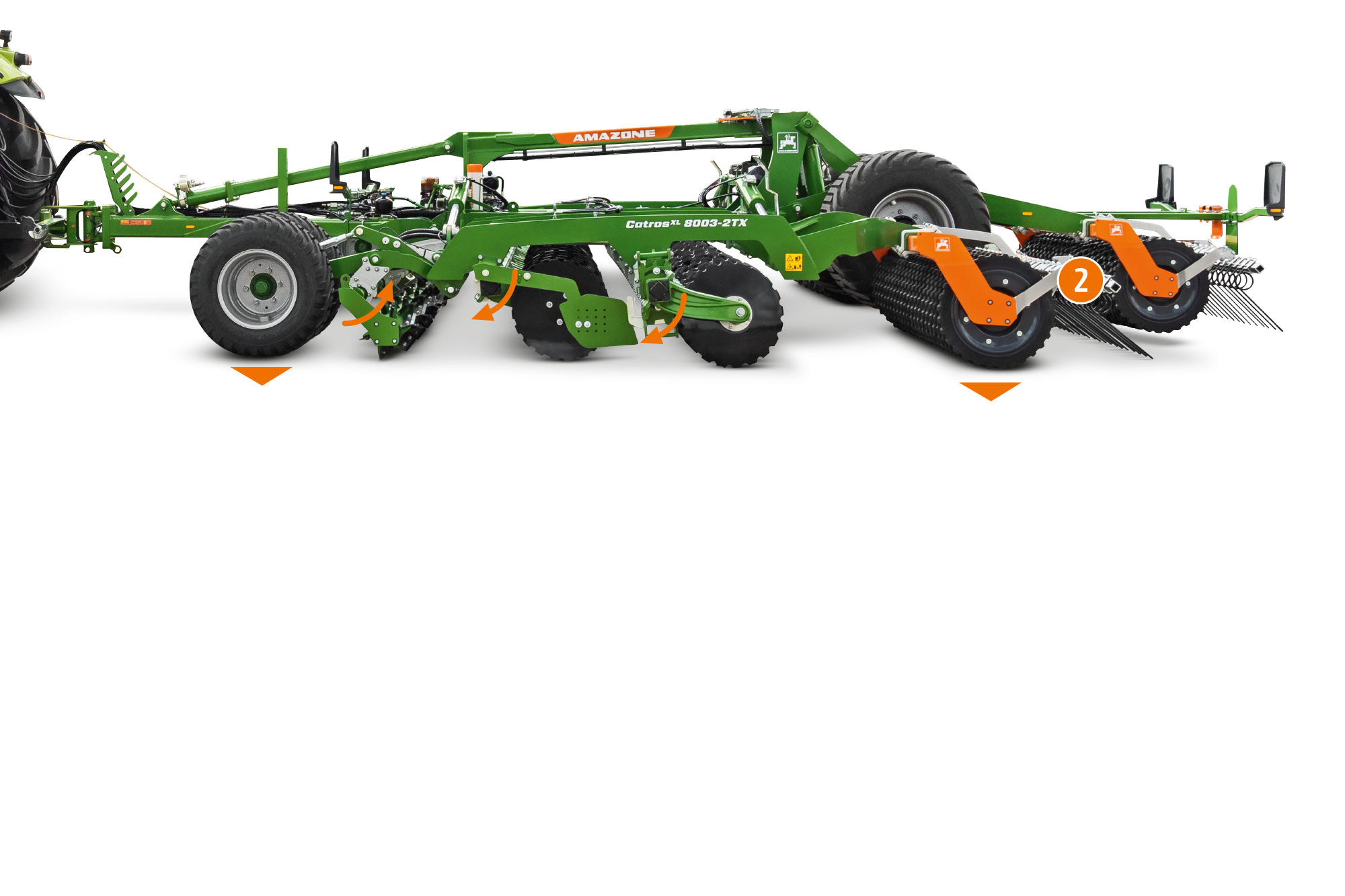 Maszyny z serii Catros 03 charakteryzują się wyjątkową koncepcją regulacji głębokości roboczej. Wał jest na stałe połączony z ramą główną. Aby ustawić głębokość roboczą, oba rzędy talerzy są w całości obracane.