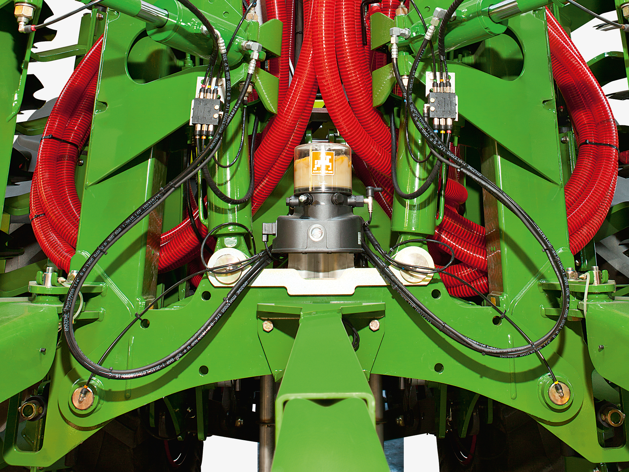 Kolejnym wyposażeniem dodatkowym oferowanym przez AMAZONE jest centralny układ smarowania do Catros+ z pakietem pro, Catros+-2TX i Catros+ 12003-2TS. Aby ułatwić smarowanie, dostępny jest ręczny system centralnego smarowania. Smarowniczka służy przy tym do zasilania wszystkich punktów w urządzeniu. Podrozdzielacze zapewniają przy tym niezawodne zaopatrzenie punktów smarowania. Zaletą tego systemu jest to, że wystarczy przyłożyć praskę smarową tylko w jednym miejscu urządzenia, bez wdrapywania się na maszynę zabrudzoną ziemią i gnojowicą.