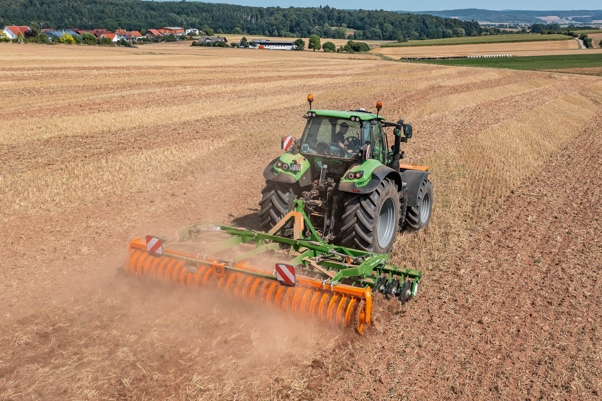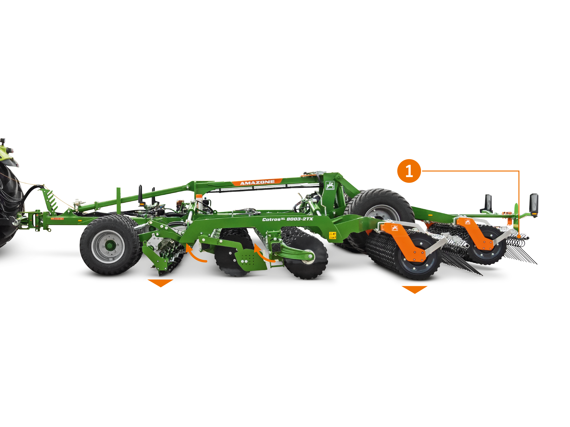 - Oprócz niezależnej regulacji narzędzia wstępnego i talerzy, przy zmianie głębokości roboczej nie zmienia się także ustawienie tylnego zagarniacza