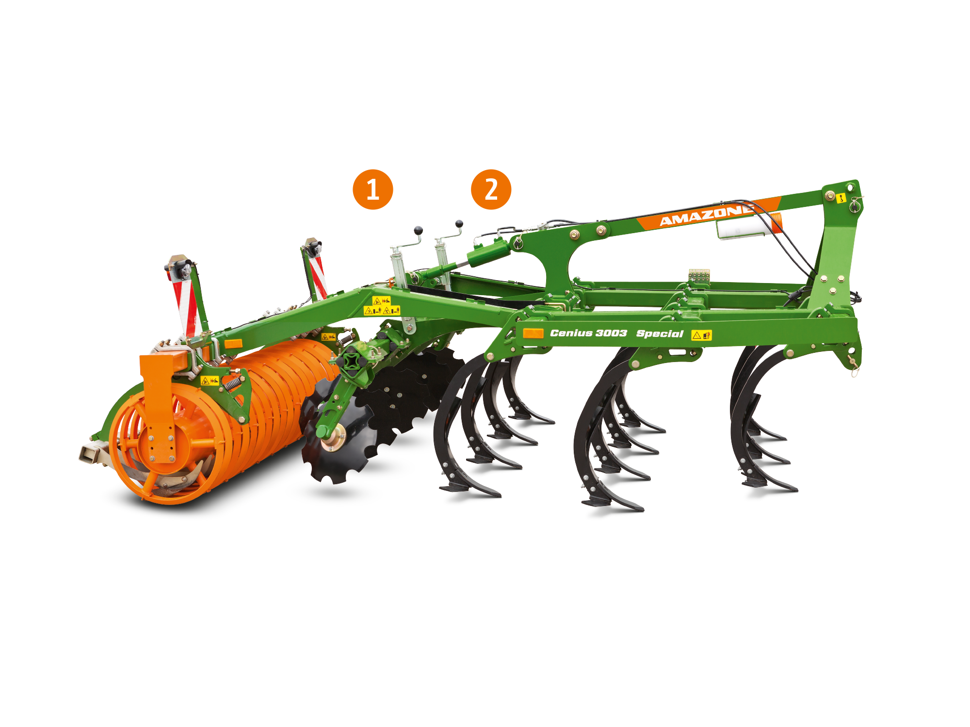 Regulacja głębokości roboczej odbywa się w standardzie bezstopniowo, mechanicznie, bez narzędzi oraz centralnie na urządzeniu za pomocą wrzeciona. Do orientacji podczas regulowania głębokości roboczej służy dobrze widoczna i kompaktowa skala. Dodatkowo Cenius jest także dostępny z hydrauliczną regulacją głębokości.
