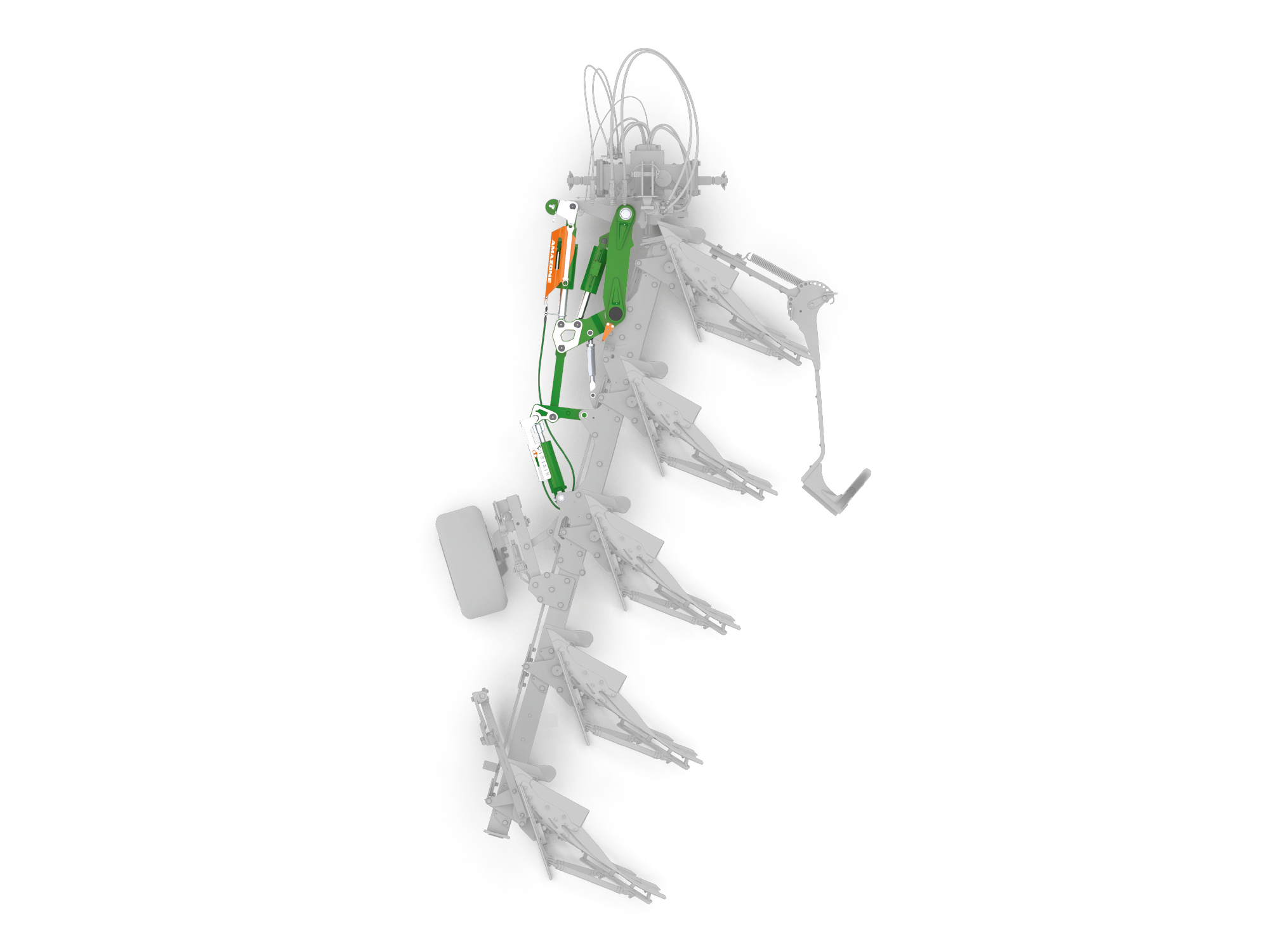 Tuż po uniesieniu pługa rama jest liniowana przed procesem obracania. Liniowanie ramy nie wpływa w żadnym stopniu na szerokość roboczą. Zapobiega to zużyciu, zwłaszcza łożysk, a jednocześnie zapewnia większy prześwit podczas obracania. Po obróceniu pługa siłownik obrotu ramy automatycznie przywraca położenie robocze ramy. W zależności od szerokości roboczej siłownik liniowania wysuwa się. Cięgło obustronnego działania przekazuje położenie szerokości roboczej na zawór i tym samym ogranicza drogę siłownika.