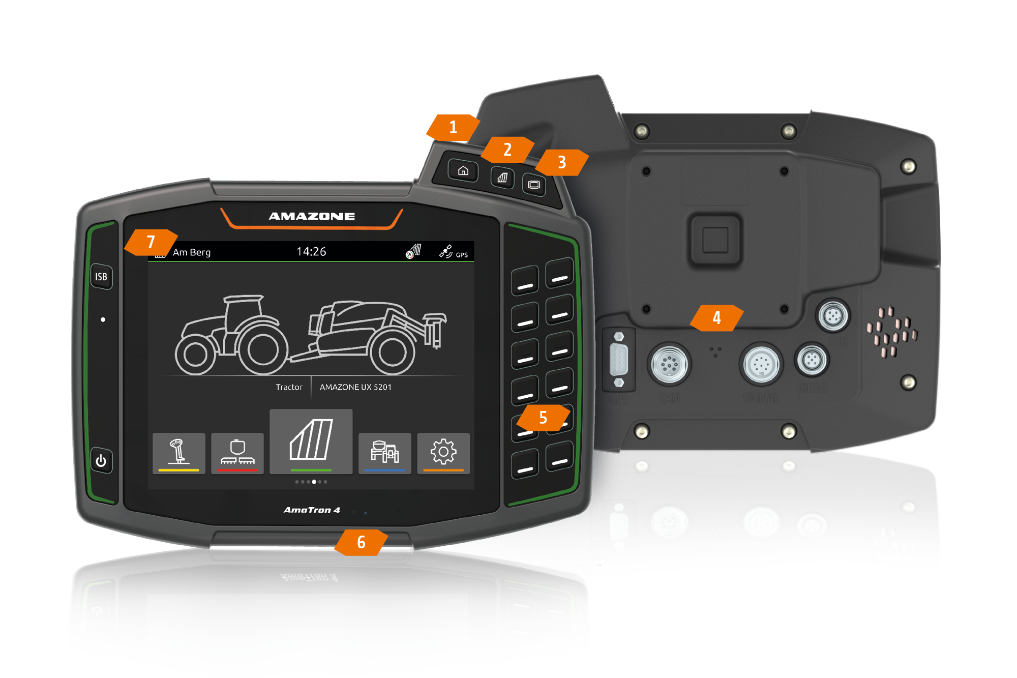 4) Złącza: Sygnał GPS, złącze ISOBUS, przyłącze kamery, 2 x złącza USB, złącze dla sygnałów z czujników, WiFi przez USB