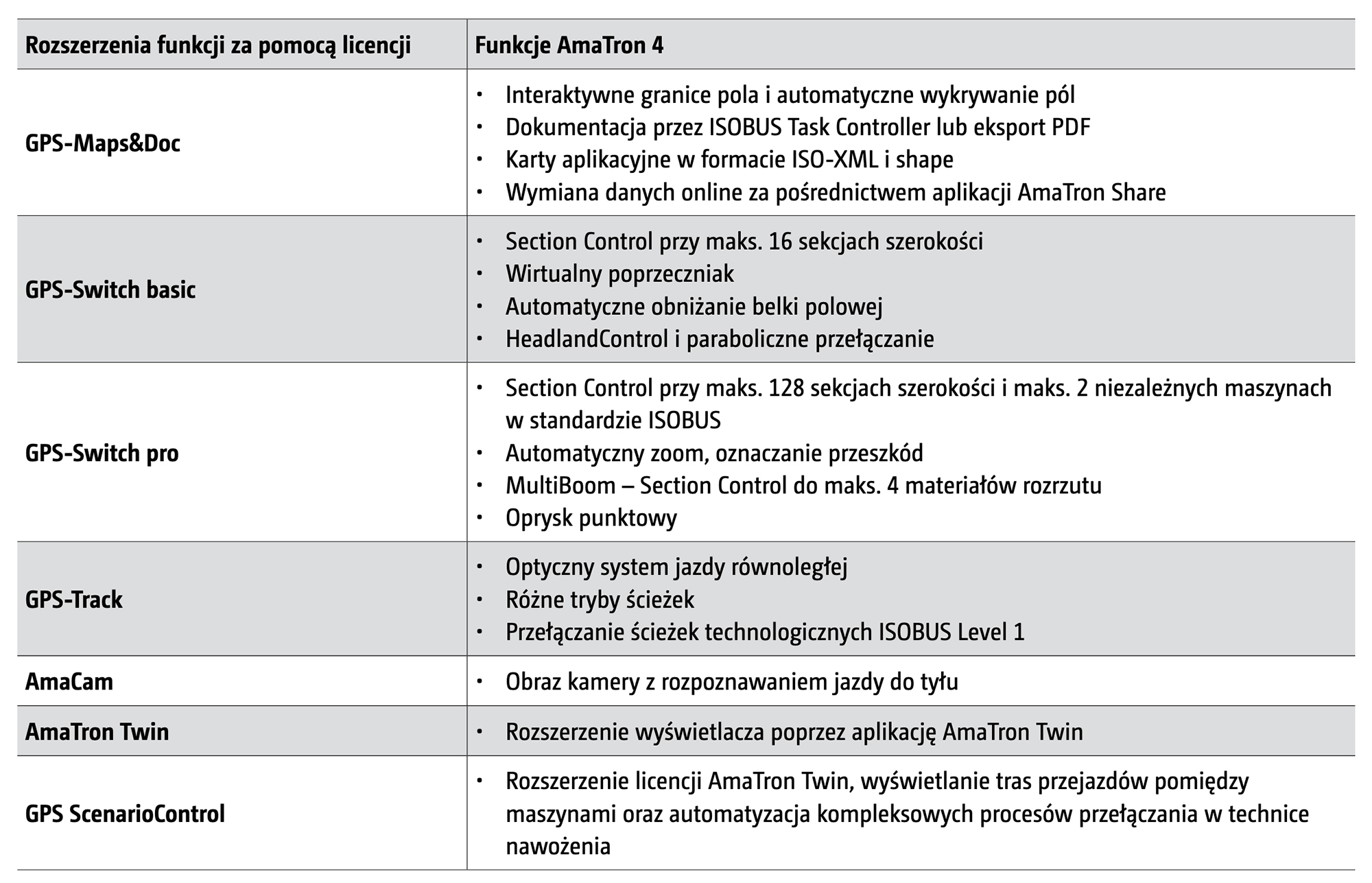 Oprogramowanie dla każdego – czy to do samej obsługi maszyn ISOBUS czy też funkcji rolnictwa precyzyjnego – AmaTron 4 zapewnia różne opcjonalne licencje na oprogramowanie, dzięki czemu spełnia wszystkie wymogi. Wszystkie licencje są wstępnie zainstalowane w AmaTron 4 i mogą zostać bezpłatnie przetestowane lub od razu aktywowane za opłatą.
